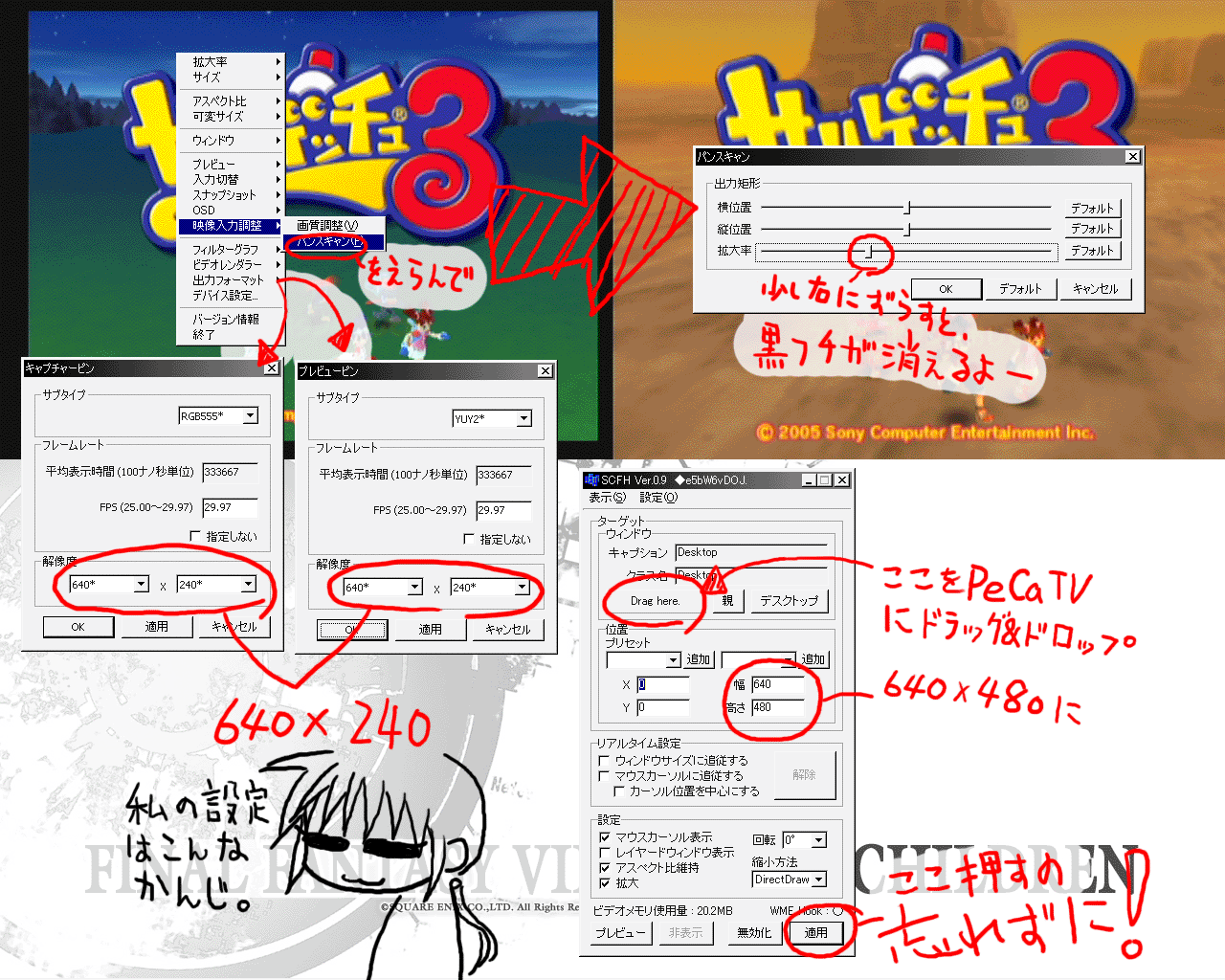 SCFHはターゲットをPeCaTVにして、位置の幅と高さを640×480にすればおk